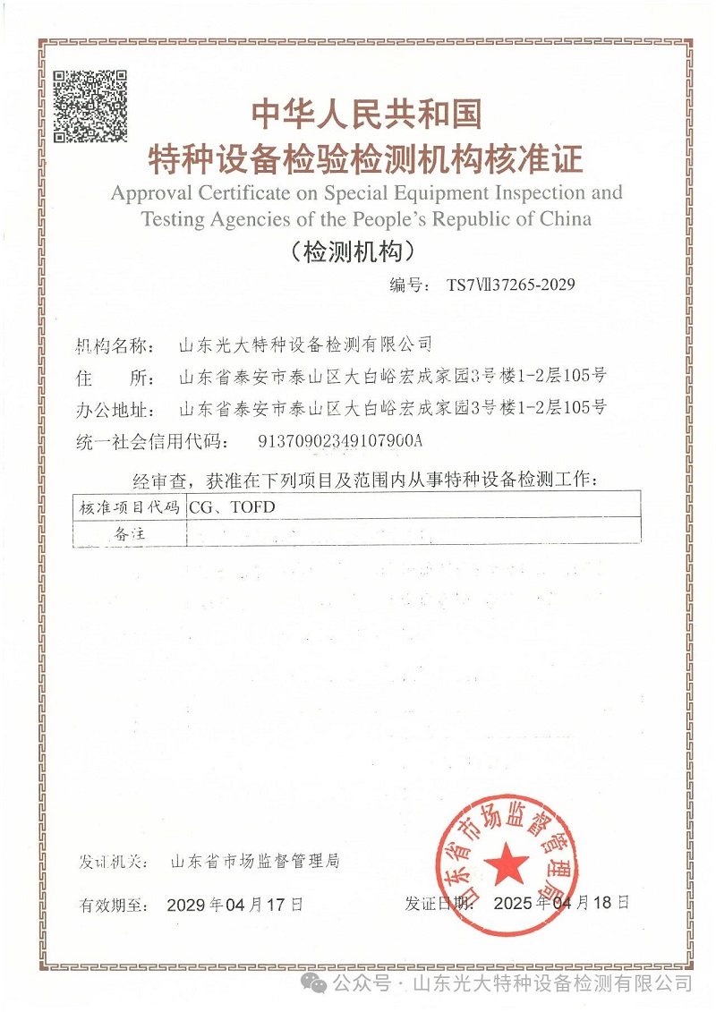 喜报 | 光大检测正式获批特种设备无损检测机构核准