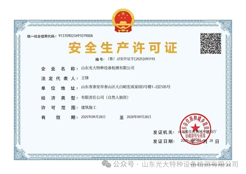近日,我公司经过主管部门的严格审核,成功获得山东省住房和城乡建设厅颁发的《安全生产许可证》。这一重要资质的取得,不仅标志着公司在安全生产管理水平、设施设备及人员素质等方面均达到了国家法定标准,更意味着公司在特种设备检验检测、检验辅助工作脚手架安装拆卸、以及防腐防水保温等一体化服务领域的综合实力实现了里程碑式的跨越,为公司未来的高质量发展奠定了坚实的安全基石。